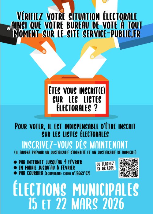 L'inscription sur les listes électorales est possible jusqu'au 4 février 2026 en ligne et jusqu'au 6 février 2026 en Mairie